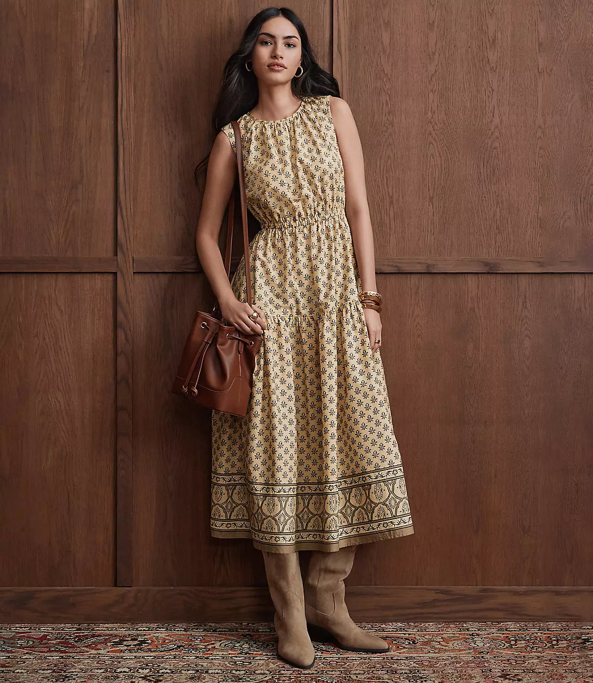 Light, breezy, and endlessly flattering—this tiered midi dress is the piece you’ll reach for on repeat. Cut in smooth woven cotton poplin, it flows with ease while the elasticized waist defines your shape just enough. A simple crew neckline and sleeveless silhouette keep the look clean and polished, while the tiered skirt adds soft movement for a feminine finish.